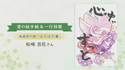 昨年度、御嵩町で行われた「愛の絵手紙&一行詩展」で入賞した、東濃実業高校2年生の松崎百花さんの作品です。