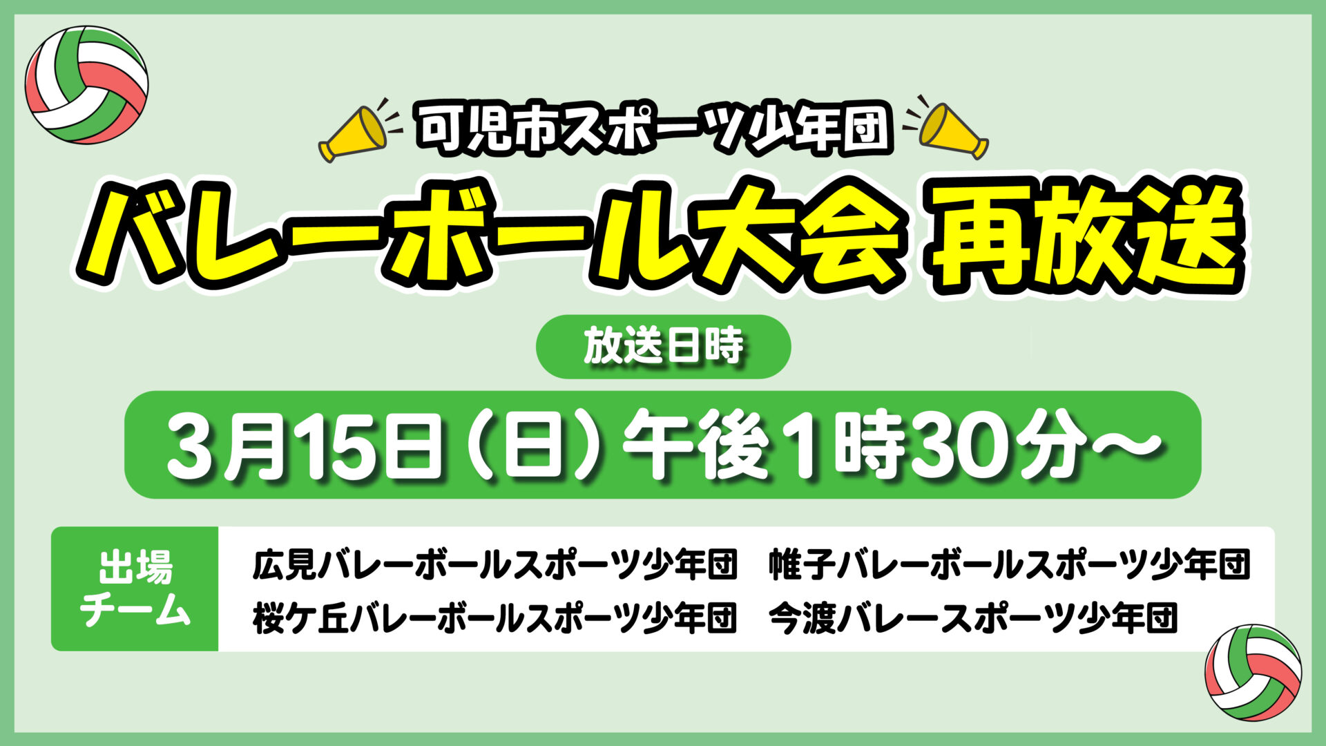 【CTK12ch】可児市スポーツ少年団 バレーボールお別れ大会再放送のお知らせ 2026/02/25 【再放送】可児市スポーツ少年団 バレーボールお別れ大会 2/22(日)に帷子小学校の体育館で行われた可児市スポーツ少年団のバレーボールお別れ大会を再放送! 放送日 3月15日(日) 時 間 午後1時30分~ プレゼント詳細・ご応募はこちら ご 応 募